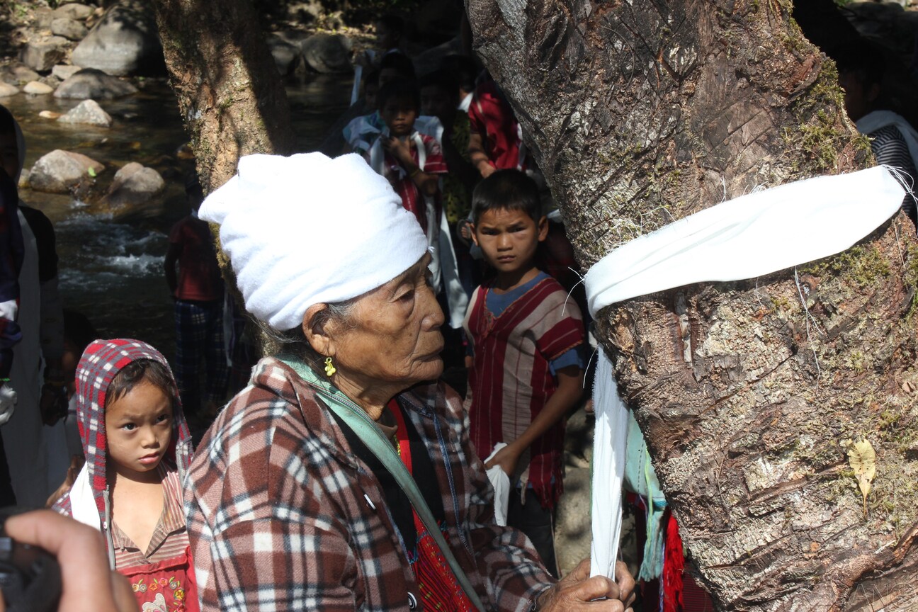 Caption: An elderly woman from Hkeh Pa in the Salween Peace Park performing tree ordination (Photo: Hsar Doe Doh Moo)